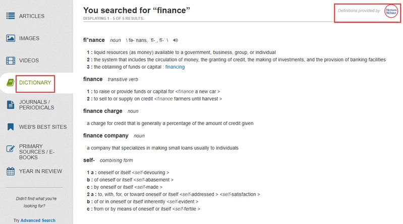 读者也可以在执行检索以后,通过左侧菜单内的图标,按类型筛选检索结果,例如⽂章(ARTICLES)、图像(IMAGES)、视频(VIDEOS)、词典(DICTIONARY)、期刊杂志(JOURNALS/PERIODICALS)、原始⽂献与电⼦书(PRIMARY SOURCES/E-BOOKS)或年鉴(YEAR IN REVIEW)。