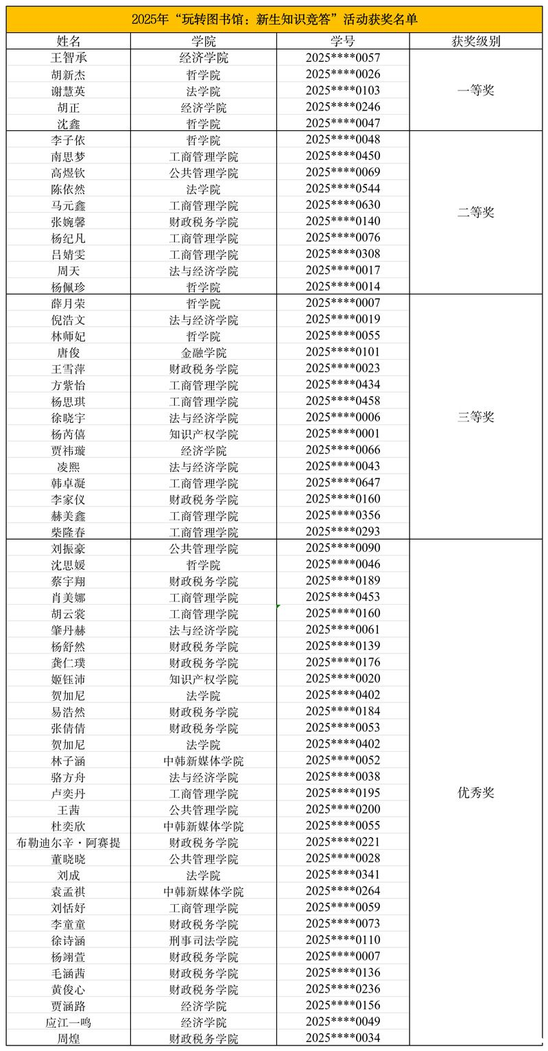 本次活动共吸引了420余名本科新生参与竞答,根据答题得分及答题时间的综合评定,最终评选出61名获奖同学,包括一等奖5名、二等奖10名、三等奖15名以及优秀奖31名(含并列2名)。感谢每一位同学的踊跃参与!