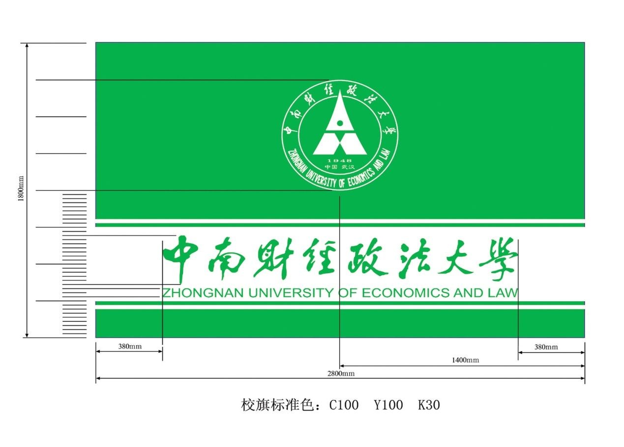 第七十四条 学校校旗为蓝白二色和绿白二色两种。校标置于旗帜上方中央,蓝底或绿底反白。邓小平题写的中文校名与学校英文校名为蓝字或绿字白底,上下各有一蓝色或绿色装饰条。校旗标准尺寸为宽2800mm,高1800mm。具体图案、制作规格、色彩分布如下: